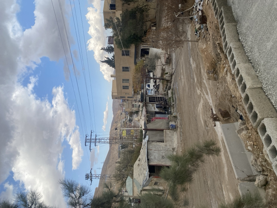 The image depicts a semi-urban landscape in Dahiyat Harasta, Syria, under a sky with significant white cumulus clouds against a clear blue background