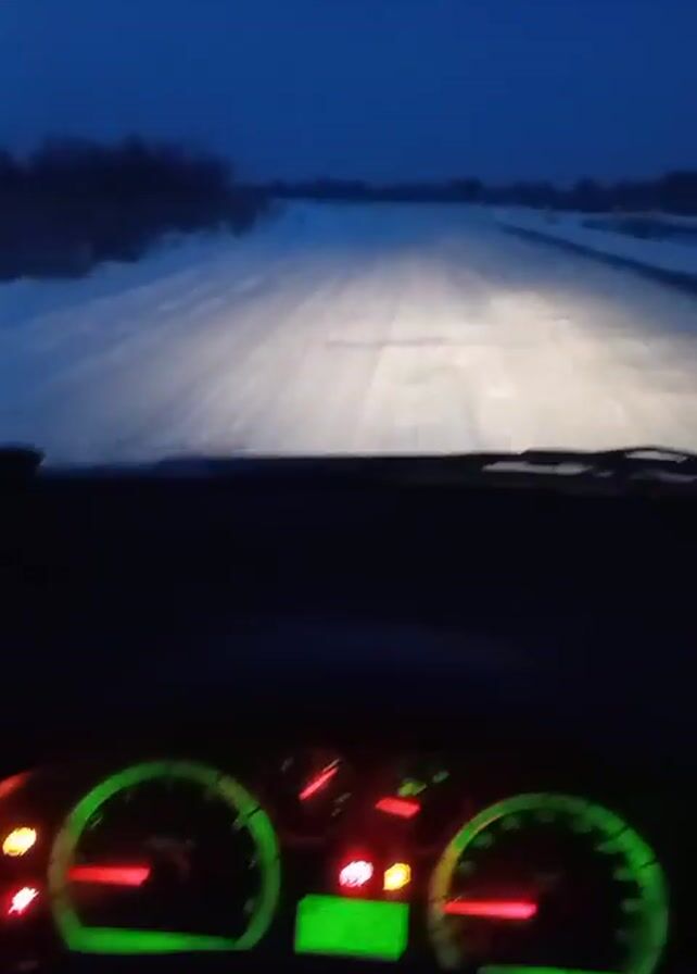 A car travels down a snow-covered road at night. The view is from inside the car, looking out the windshield. The road is illuminated by the car's headlights. The dashboard is visible, showing the speedometer and other gauges. The sky is dark blue. Trees and bushes are visible on either side of the road.