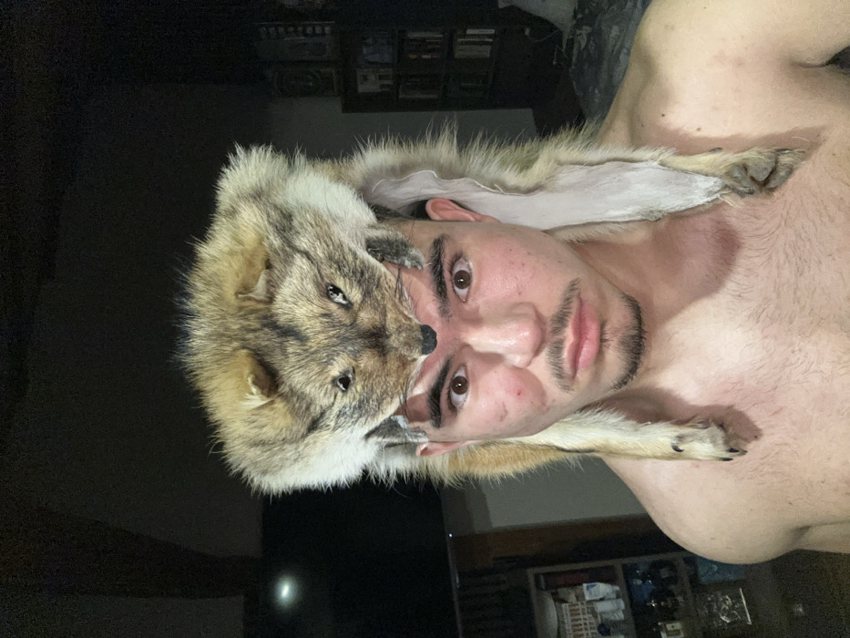 The image depicts a male individual in an indoor domestic setting located in Voluyak, Bulgaria. The subject, bare-chested and exhibiting a muscular build, directly faces the camera with a wide-eyed expression and slightly pursed lips. He has dark, short hair, a goatee, and a mustache. A reddish mark or abrasion is visible on his right cheek (viewer's left). On his head, he wears a taxidermied fox pelt, with the fox's head resting on his forehead. The fur, primarily reddish-brown and greyish-brown, drapes over his head and shoulders, and the pelt's paws hang down on either side of his head. The background is dimly lit and includes a dark, reflective surface consistent with a television screen and a light-colored shelving unit containing various objects on the left. On the right, a dark bookshelf filled with books and other items is visible. The individual is posing for the photograph.