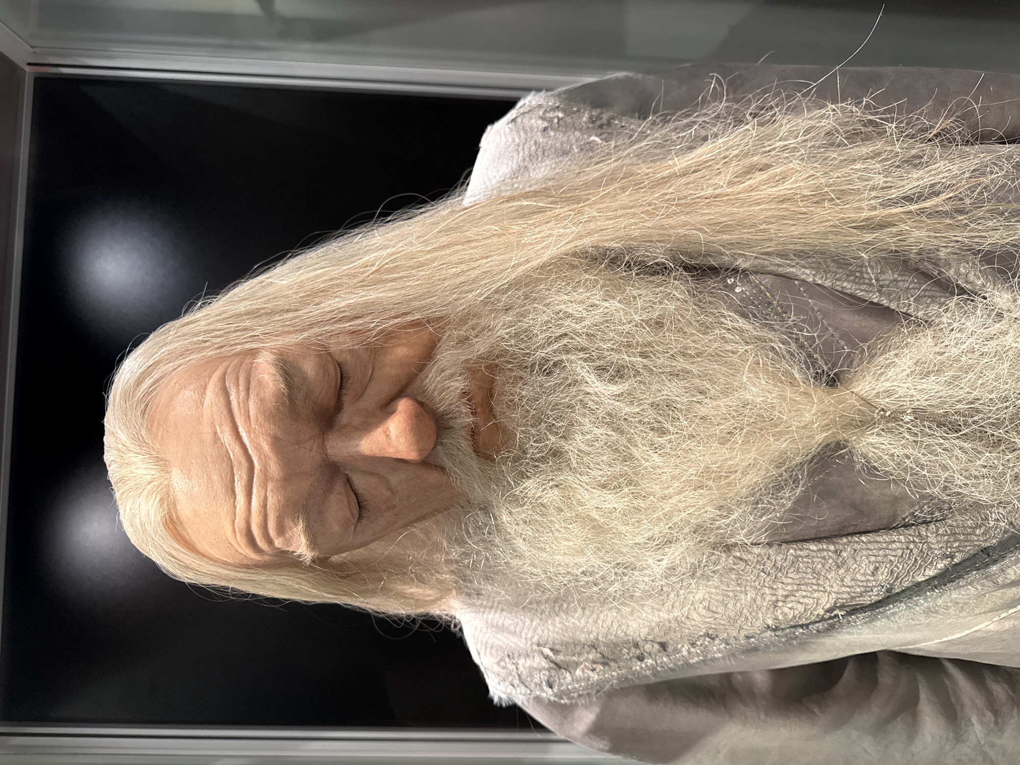 A detailed, lifelike bust of an elderly male is centrally positioned within a display environment in the city of Three Rivers, United Kingdom