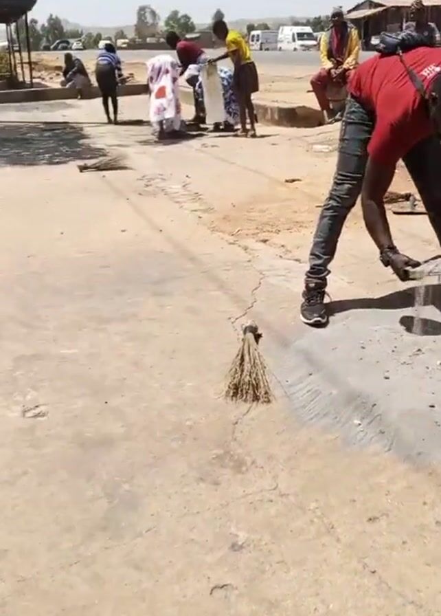 group of people working on a dusty road in an outdoor setting. In the initial scene, two men are working on something on the ground covered in a grey powder. One is wearing a red shirt and jeans, the other is wearing a vest, a cap, and jeans. There is a small box or container near them, as well as a broom to the side. Additional people are seen sitting or standing nearby, observing the activity. In the background, there are buildings, vehicles, and what appears to be a distant hill. The video then transitions to show more of the street or road. People are visible in the distance sweeping or cleaning the area. They are wearing various outfits. There is a covered structure in the background. The video shows a dusty, outdoor environment with people performing cleaning or construction-related tasks.