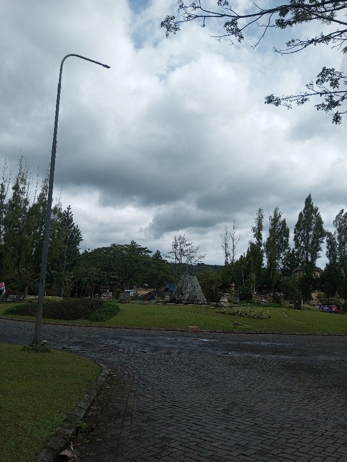 A grey brick road leads to a grassy island with a pyramid-shaped stone structure. The island is surrounded by trees of varying heights. A tall street light stands to the left of the road, extending into a cloudy sky. Branches from another tree are visible in the upper right corner of the image. The scene appears to be in a park or garden setting.
