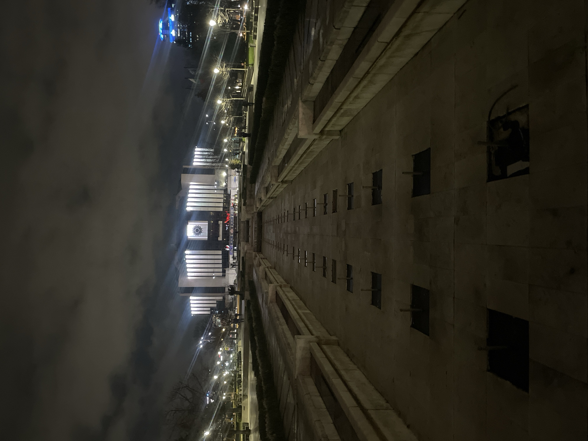 National Palace of Culture (NDK) in Sofia, Bulgaria, at night. The building is illuminated, with its distinctive facade and clock tower visible through the low-hanging clouds. A long, paved pedestrian walkway extends away from the building, lined with low walls and shrubbery. Streetlights illuminate the walkway. Recessed areas, containing drainage, are visible along the walkway's surface. A tall building is also visible in the distance on the left, also lit up.