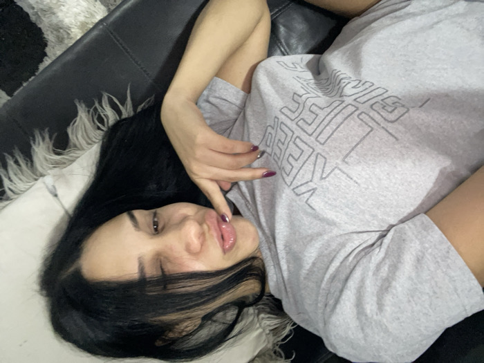 An adult female is depicted lying in an indoor residential setting, likely on a dark-colored couch or sofa. She wears a light grey, short-sleeved t-shirt with the text "KEEP LIFE" partially visible in a stylized, block-outlined font. Her dark hair, featuring lighter streaks, is fanned out around her head and shoulder. She is positioned facing the camera with her head slightly tilted, exhibiting a faint smile and her right eye appearing partially closed. Her right hand is raised, with the index finger touching her lower lip, revealing dark-colored fingernail polish. A white pillow with decorative fringe is visible behind her head, and a light-colored, textured rug is present on the floor in the lower right quadrant of the image. The specific location within the city of Altagracia, Venezuela, cannot be determined from the visual information provided in the image.