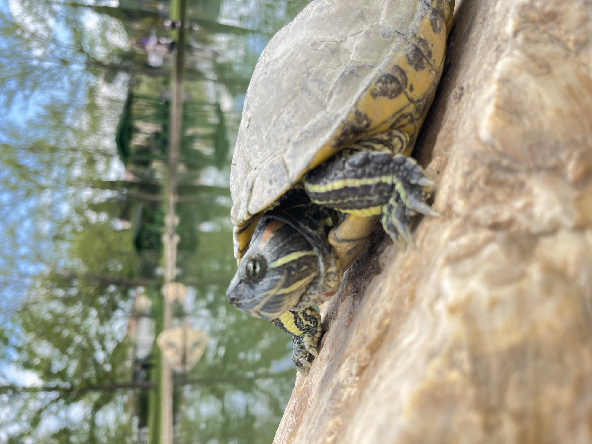 A turtle, possibly a Red-eared Slider, is perched on a light-colored rock