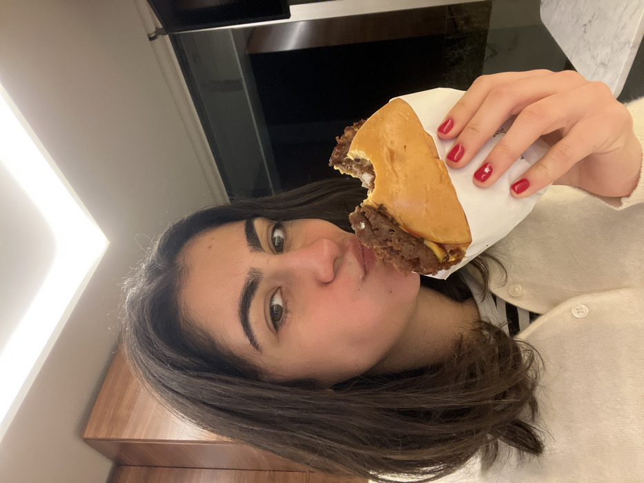 A woman with dark hair and brown eyes is shown in a selfie while holding a burger