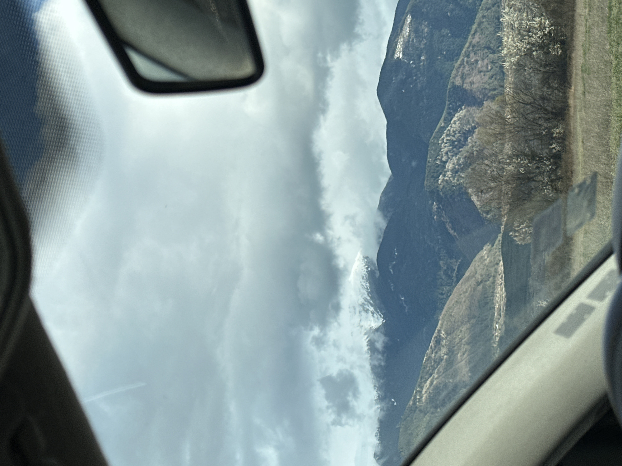 mountain range, possibly in the vicinity of Cherven Breg, Bulgaria, as viewed from inside a vehicle. Clouds are visible in the sky, partially obscuring the mountain peaks. The side mirror of the vehicle is in the upper left corner. The edge of the car's interior is visible on the right side of the image. The vegetation appears to be a mix of trees and fields. The landscape seems hilly. No people are directly visible in the image.