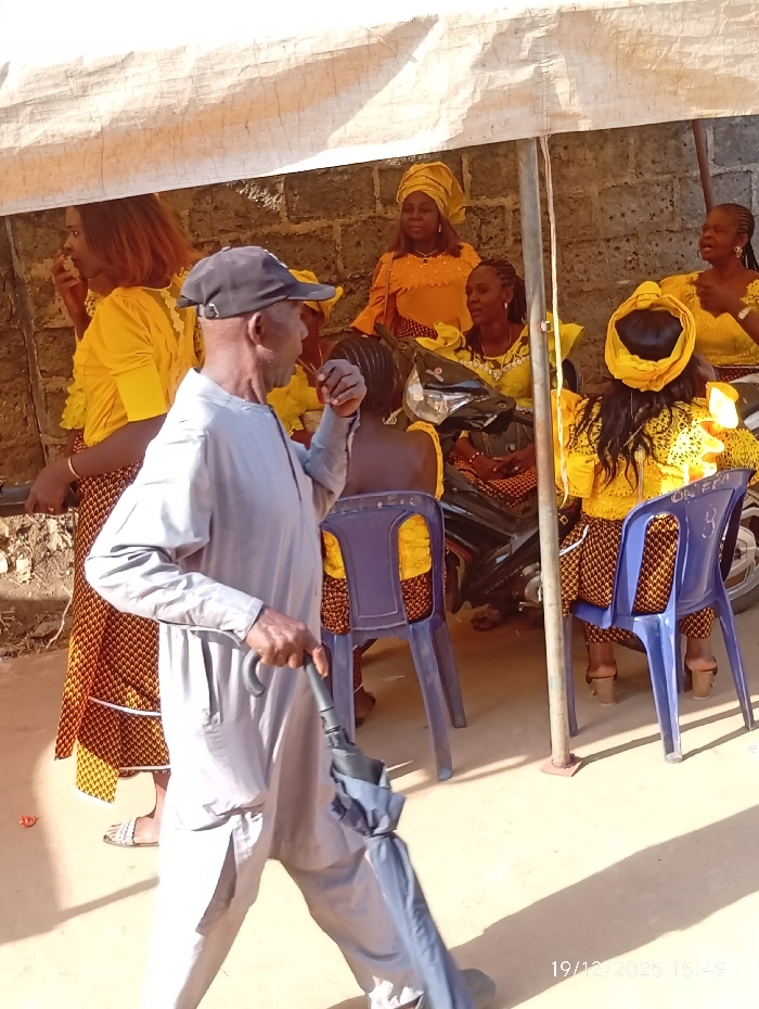The image captures an outdoor social gathering in Isinyi-Nando, Nigeria, taking place under a temporary canopy made of light-colored fabric. In the foreground, an elderly male, wearing a grey long-sleeved tunic, matching trousers, and a dark baseball cap, walks from left to right, holding a partially folded dark umbrella downwards in his right hand. He appears to be looking towards the right side of the frame. Behind him, under the canopy, a group of approximately seven women are visible, most dressed in coordinated yellow attire, some with matching head wraps. Several women are seated on blue plastic chairs, while others stand or are partially obscured. A woman on the far left, wearing a yellow top and a patterned skirt, has her hand near her mouth. A black and silver motorcycle is parked behind some of the seated women. The background consists of a rough concrete block wall. The ground surface is light-colored, possibly concrete or packed earth, with shadows indicating overhead sunlight. A digital timestamp "19/12/2025 15:49" is visible in the lower right corner.