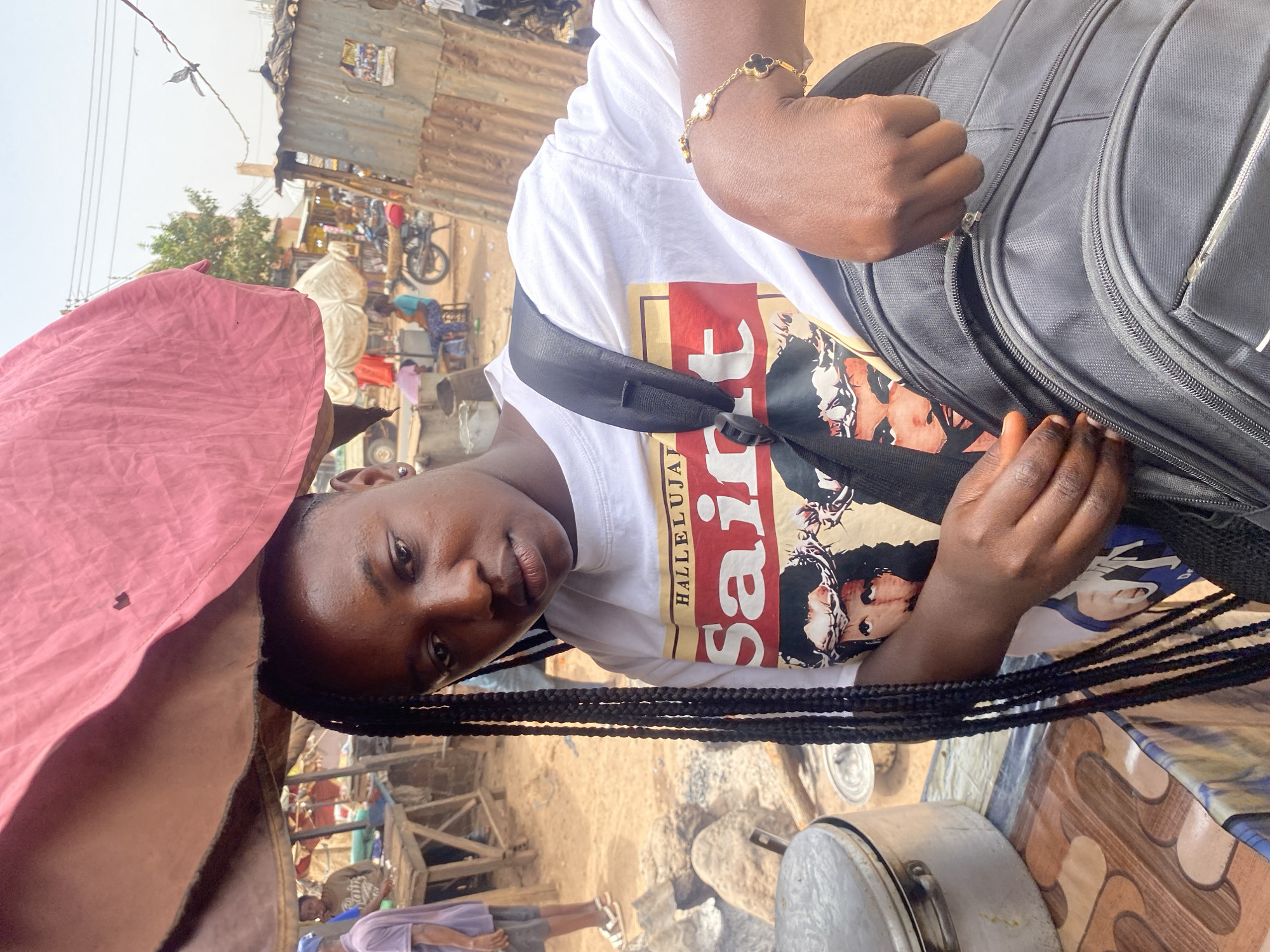 The image depicts an outdoor market scene in Rido, Nigeria. The central subject is a dark-complexioned individual with long, dark braided hair, positioned directly facing the viewer. They are wearing a white short-sleeved t-shirt with a graphic design featuring "HALLELUJAH Saint" in prominent red and gold lettering, overlaying two stylized images of a man wearing a crown of thorns. A black backpack is worn over both shoulders, and the individual's hands are engaged in zipping or unzipping a front compartment of the backpack. A gold-colored bracelet with black and white four-leaf clover motifs is visible on the right wrist, and a silver stud earring is present in the left ear. A pink fabric canopy hangs overhead, partially obscuring the top of the frame. To the left of the central figure, a large, lidded silver pot rests on a table covered with a patterned cloth. Further into the midground, a man in a light purple t-shirt and dark shorts, wearing light-colored sandals, stands near a wooden market stall. Another man in a brown t-shirt is visible behind this stall. The ground throughout the visible area is unpaved, consisting of light brown dirt and scattered rocks. The background reveals a busy, informal market environment under a bright, hazy sky. On the right, a structure constructed from corrugated metal sheets, possibly a stall or shack, features a visible poster. Overhead, utility wires traverse the scene, with a bird perched on one. Other individuals, a parked motorcycle, and an additional market stall with a white umbrella canopy are visible in the distance.