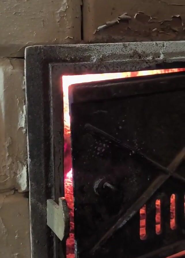 close-up of a partially open cast iron oven door revealing a fire burning inside. The surrounding wall is white with peeling paint. The door is black, with a simple latch and patterned openings. Bright orange and red flames can be seen through the opening.