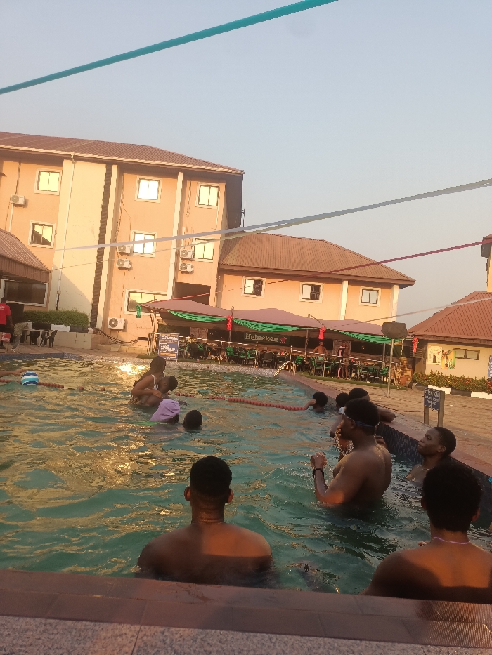 The image depicts an outdoor swimming pool area within a leisure establishment in Asaba, Nigeria, observed during late afternoon