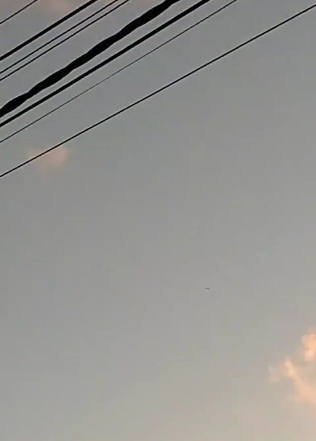 light gray sky with a single, fluffy, pink-tinged cloud. A dark roofline is visible at the bottom of the frame. A small, distant object, possibly a plane or drone, moves across the sky. Power lines are visible at the top of the frame.