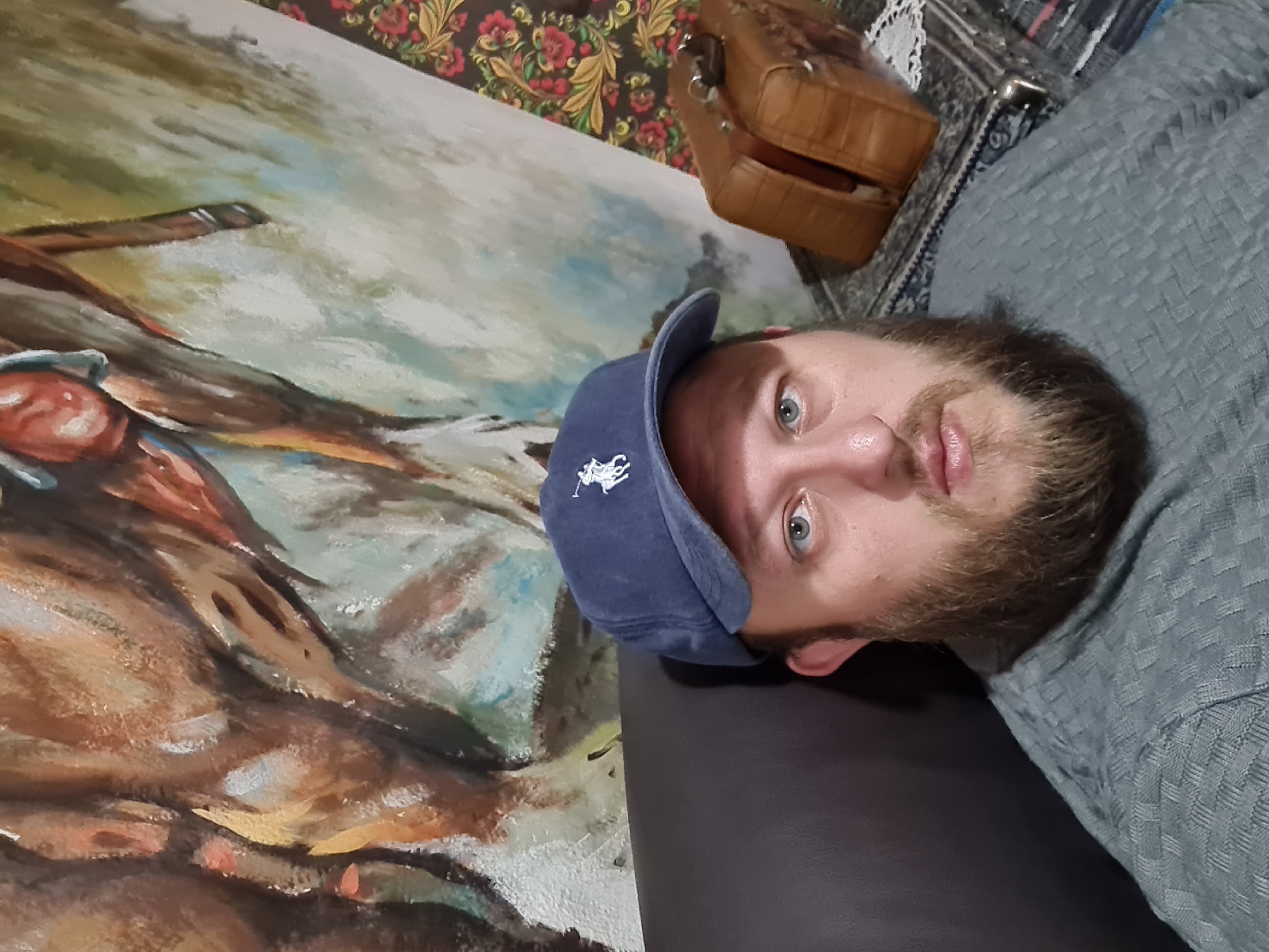 A man with light blue eyes and a beard is wearing a blue baseball cap with a white polo player logo. He is lying on a dark brown surface, possibly a couch or chair. Next to him is a painting depicting what appears to be a horse and rider in a landscape with brown, tan, and blue hues. In the upper left corner of the image, there is a section of wall with floral patterned wallpaper in dark red, green, and gold tones. Above that, partially visible, is a tan leather bag or case. A patterned grey and blue blanket is also visible. The location is unknown.