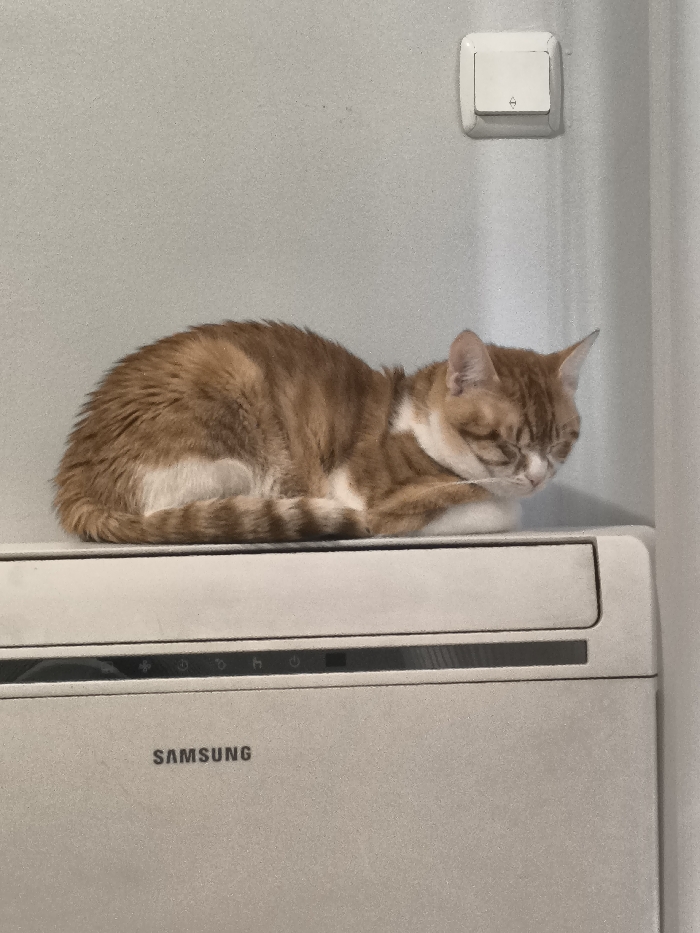 - "An orange and white tabby cat is observed curled and resting with its eyes closed, positioned atop a wall-mounted Samsung air conditioning unit in an interior room in Varna, Bulgaria" by FM-ug28G3, licensed under CC BY 4.0