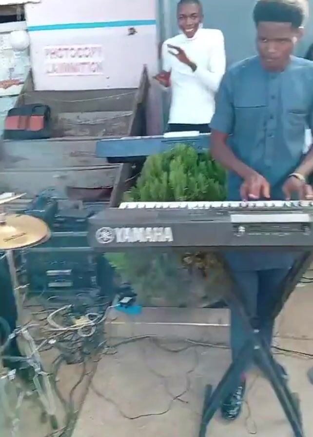n outdoor performance with a live band and people dancing. The band consists of a drummer wearing headphones, a keyboard player next to a Yamaha keyboard, and a guitar player in a green shirt. There are speakers and equipment set up around them. A sign for "FREEDOM PHOTO STUDIO QUALITY GUARANTEED" and another for "PHOTOCOPY LAMINATION" are visible in the background. The environment appears to be a street with people passing by. Several people are dancing to the music. One person wearing sunglasses, a white jacket, and jeans is moving in a rhythmic way.