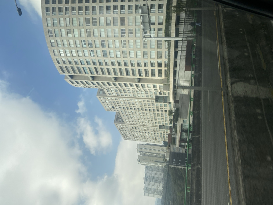 A view from inside a vehicle shows multiple tall buildings arranged in a row, receding into the distance. The buildings are light-colored with numerous windows. A street runs alongside them, featuring a yellow line marking the edge of the road. The sky is visible with clouds, and the angle suggests the perspective is from a moving vehicle. The image is slightly tilted to the left.