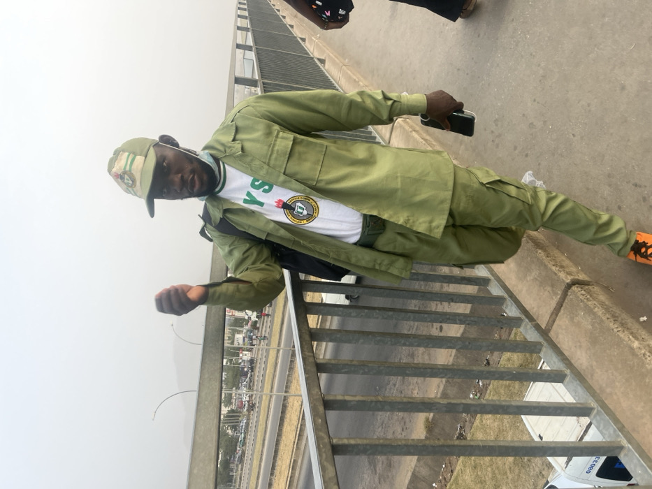 A man wearing a light green suit and matching hat, with a t-shirt imprinted with "NYSC," stands on what appears to be a bridge