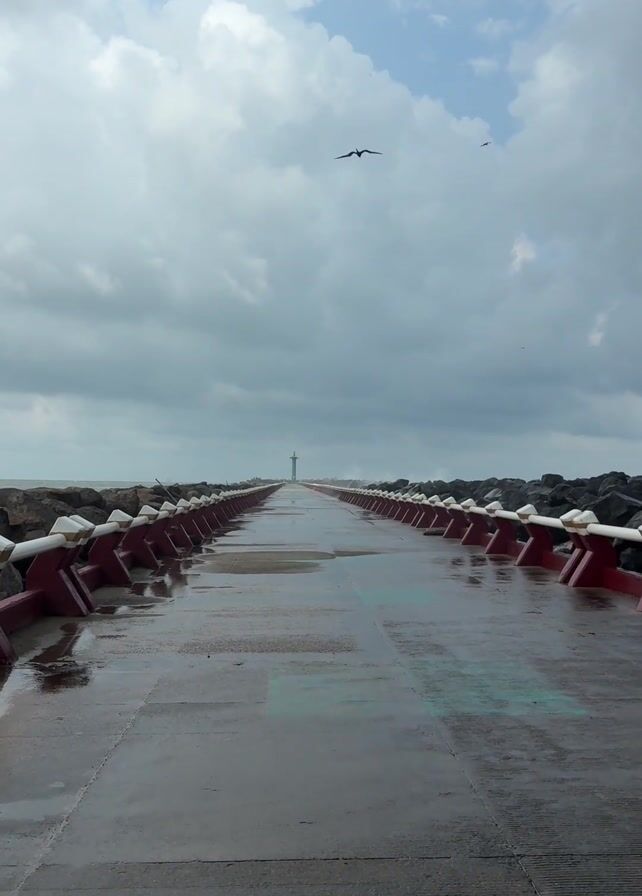 wet concrete pier extending into the sea under a cloudy sky. The pier is lined on both sides with rocks and concrete barriers painted red and white. In the distance, at the end of the pier, is a structure resembling a lighthouse or tall tower. Several birds are flying in the sky above the pier. The pier is wet, reflecting the sky and surrounding elements.