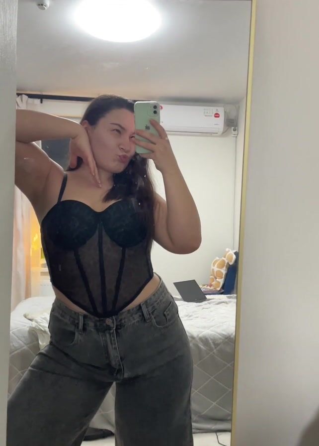 A young woman is posing for a mirror selfie in a room. She is wearing a black, see-through corset top and gray jeans. She holds her phone in her right hand and uses her left hand to pose, at one point making a hand gesture of horns. In the background is a bed with a laptop and a stuffed animal on it. There is an air conditioner mounted on the wall. The mirror has a gold frame. The walls are white. The lighting is bright.