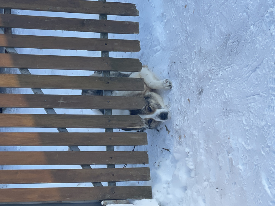 - "The scene depicts a bicolored dog, primarily white with gray and brown markings, lying in snow" by FM-NoKcg2, licensed under CC BY 4.0