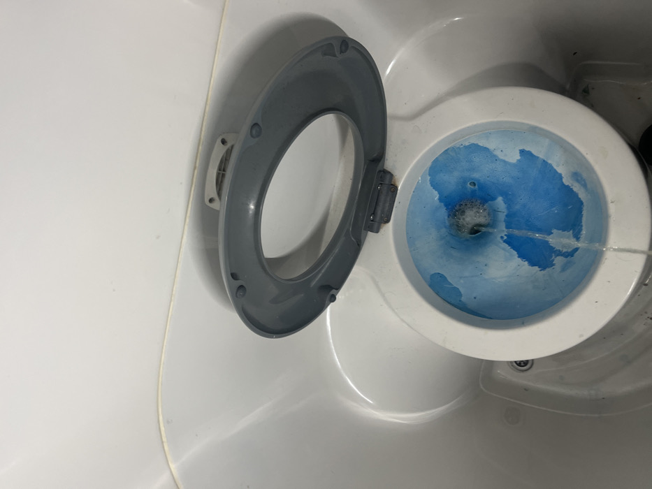 A marine toilet with blue fluid in the bowl is captured from above