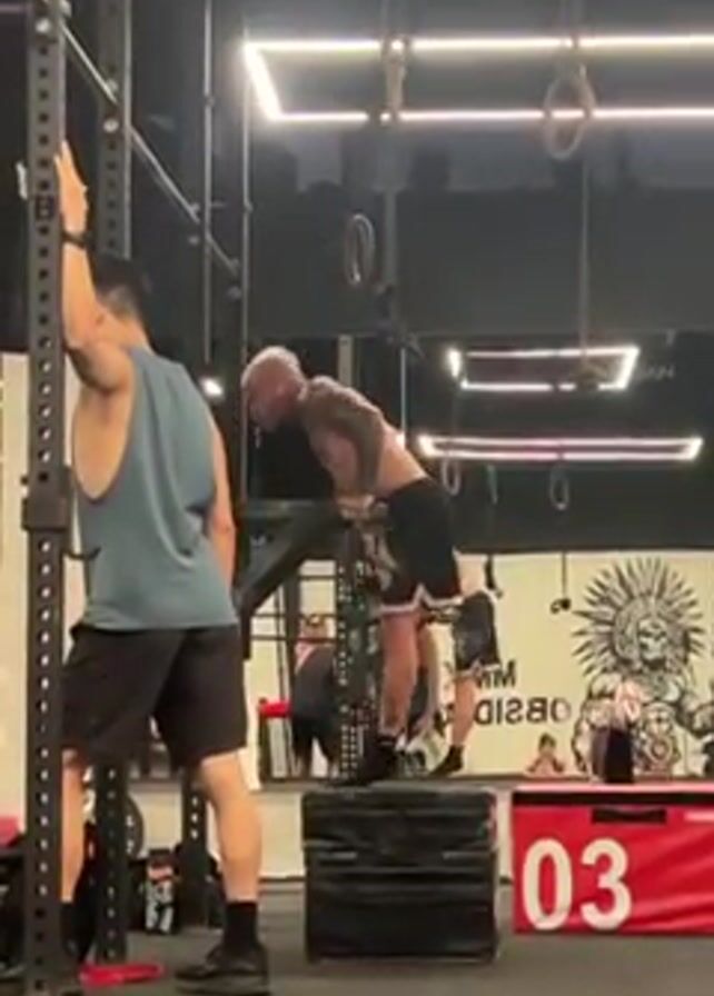 three men in a gym. One man, wearing a turquoise tank top and black shorts, stretches with his hand on a black metal rig. In the center of the frame, a heavily tattooed man with a shaved head stands on a black block, then hops down and rubs his hands together. Another man, in black shorts and a white shirt, is visible behind the block. The gym has a mirror on the back wall with a logo that includes a Native American headdress visible on the right. There is a digital timer to the right of the block showing "03".