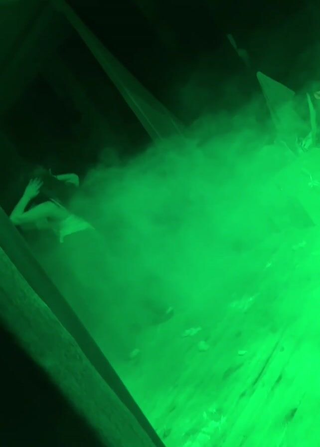 room lit in green light with smoke. There are wooden boards visible on the floor. The ceiling appears slanted with exposed beams. There are no people visible. The source of the smoke and green light is not visible.
