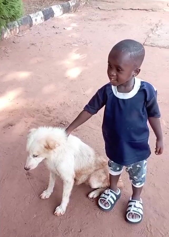 A young boy stands on a reddish dirt ground next to a light-colored, medium-sized dog that is sitting