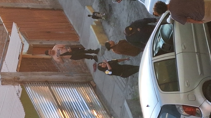 This image captures a street scene in Mariano Melgar, Peru. A shirtless male, exhibiting tattoos on his chest, stands on a paved sidewalk in the upper background, adjusting a dark garment he holds. He is positioned in front of a building with a light brown vertical slatted gate and a corrugated metal fence. Below him, on a lower section of the pavement, a woman with dark hair, wearing a black long-sleeved shirt with yellow and white arm stripes and dark pants, gestures emphatically with her right arm, her mouth open as if speaking or shouting. Adjacent to her, a second woman with dark hair tied back, wearing a brown jacket, stands observing towards the left. Partially visible behind her is a third person, a male in a dark hoodie and baseball cap. To the right, a small black and white dog stands on a dirt patch behind a yellow curb. In the foreground, a silver five-door hatchback car is parked, with its interior visible through the windows. To the far right, a fourth woman with dark curly hair, wearing a dark t-shirt and light pants, stands facing away from the viewer, next to the silver car. A second white vehicle is partially visible on the far right. The environment features brick walls and simple residential architecture, with a corrugated metal awning visible above the gate in the background.