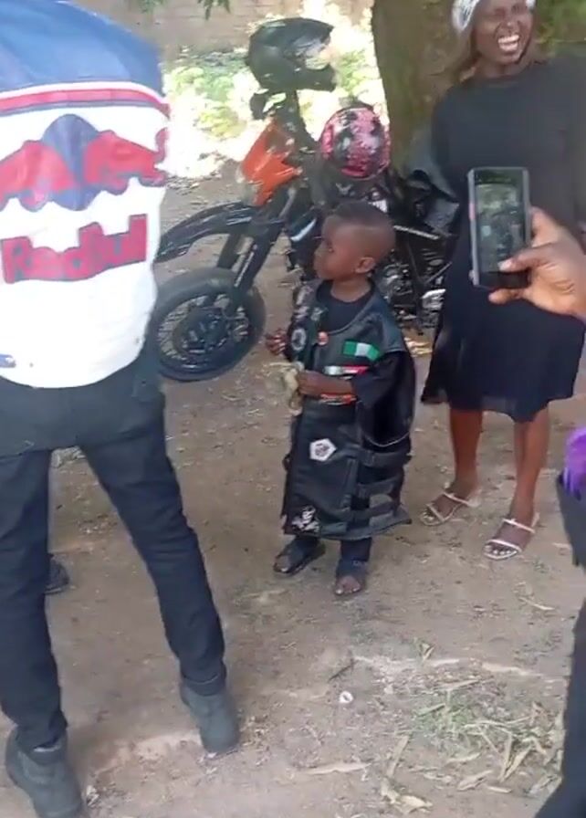 group of people gathered outdoors, possibly for an event or celebration. A young child dressed in an outfit that appears to mimic motorcycle gear stands in the center. People are taking photos of the child with their mobile phones. Behind the child is a parked motorcycle. There is a woman with a white head covering. A man carrying a baby in a carrier walks toward the child. The surroundings include trees and what appears to be a dusty ground. Other parked motorcycles are visible. Several adults are standing around. The general atmosphere seems cheerful.