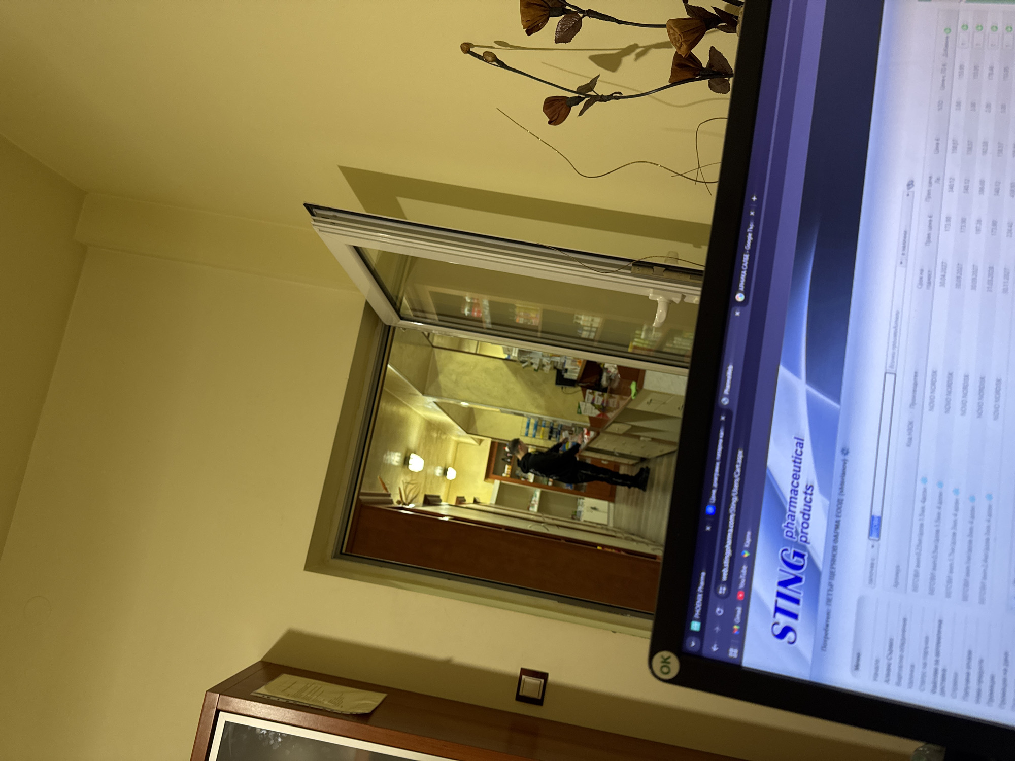 The image displays an interior scene, observed from a slightly elevated perspective, looking into an adjacent room through an open doorway. The location is a pharmaceutical business, likely a pharmacy or distribution office, in Razlog, Bulgaria. In the immediate foreground, the upper portion of a black laptop screen is visible, displaying a web browser showing a page from `web.stingpharma.com/Sting/Users/Cart.aspx` with the prominent logo "STING pharmaceutical products." Bulgarian text on the screen includes "Потребител: ПЕТЪР ЧЕРВЕНОВ ФАРМА ЕООД." A circular green sticker labeled "OK" is affixed to the laptop's upper-left bezel. To the right of the laptop, against a plain light yellow wall, a decorative cluster of dark brown, dried floral elements on thin stems is present. To the left of the doorway, part of a dark wooden cabinet or frame is visible, with several white papers tucked into its side. Below this, a brown electrical switch or outlet plate is mounted on the light yellow wall. Through an open doorway with a white frame, an individual is visible standing in an adjacent, brightly illuminated room. This person, dressed in dark attire (black jacket, black pants, black shoes), stands behind a white counter with multiple drawers, facing away from the camera towards the back of the room. They appear to be engaged in an activity involving items on the counter. The room features shelving units along the walls, stocked with various packaged products, consistent with a retail pharmacy environment. The ceiling of this room is equipped with multiple rectangular overhead light fixtures, casting bright, uniform illumination.