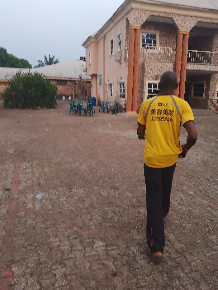 A man in a yellow shirt and dark pants walks away from the camera, toward a two-story building. The building has a peach facade with brown columns and a balcony. Green chairs and a blue container are grouped together in the building's yard, near a green bush and another building. The ground is a mix of brown dirt and sparse vegetation. The sky appears overcast.