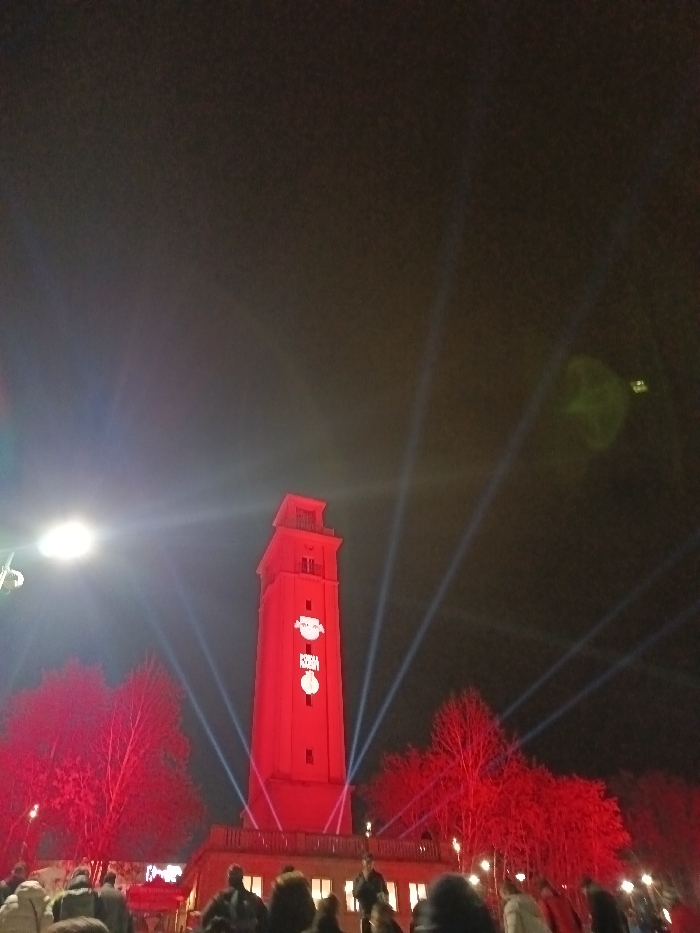 A tall, red-lit tower stands illuminated at night. The tower has white designs on its façade. Beams of light shoot upwards from the tower's base. Trees surrounding the tower are also lit in red, adding to the vibrant scene. People are gathered in the foreground, their figures silhouetted against the bright lights. The sky is dark, providing a stark contrast to the brightly lit tower and its surroundings.