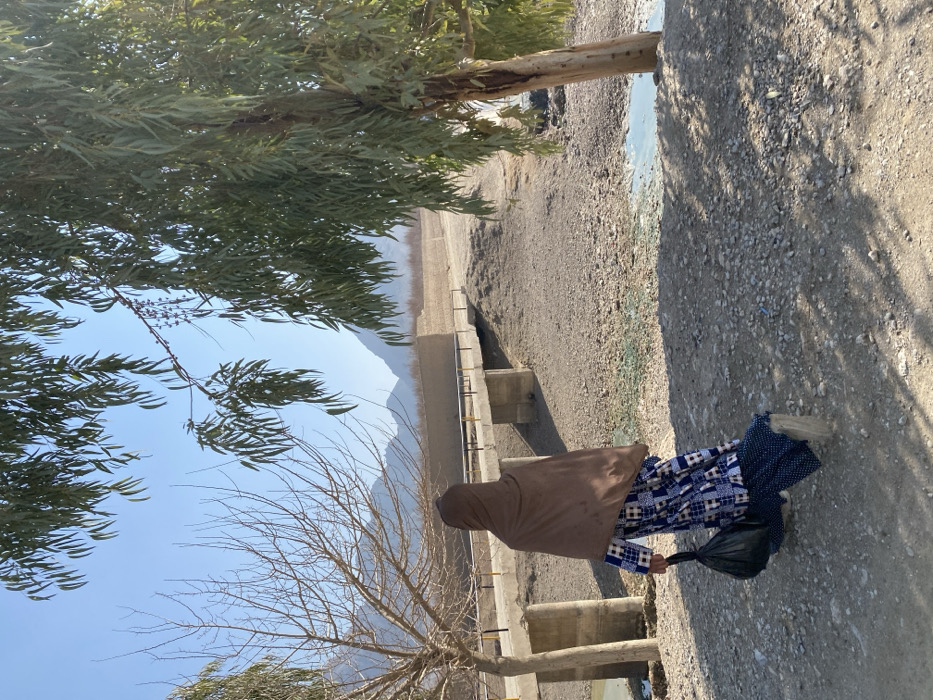 A person in a brown hijab and patterned blue dress walks along a concrete path next to a shallow canal with support structures. Bare tree branches spread from a lower left tree, contrasting with the green leaves of an overhead tree. A black plastic bag hangs from the person's hand. A mountain looms in the distance under a clear blue sky. The ground is dry and dusty. The image is captured in daylight with distinct shadows.