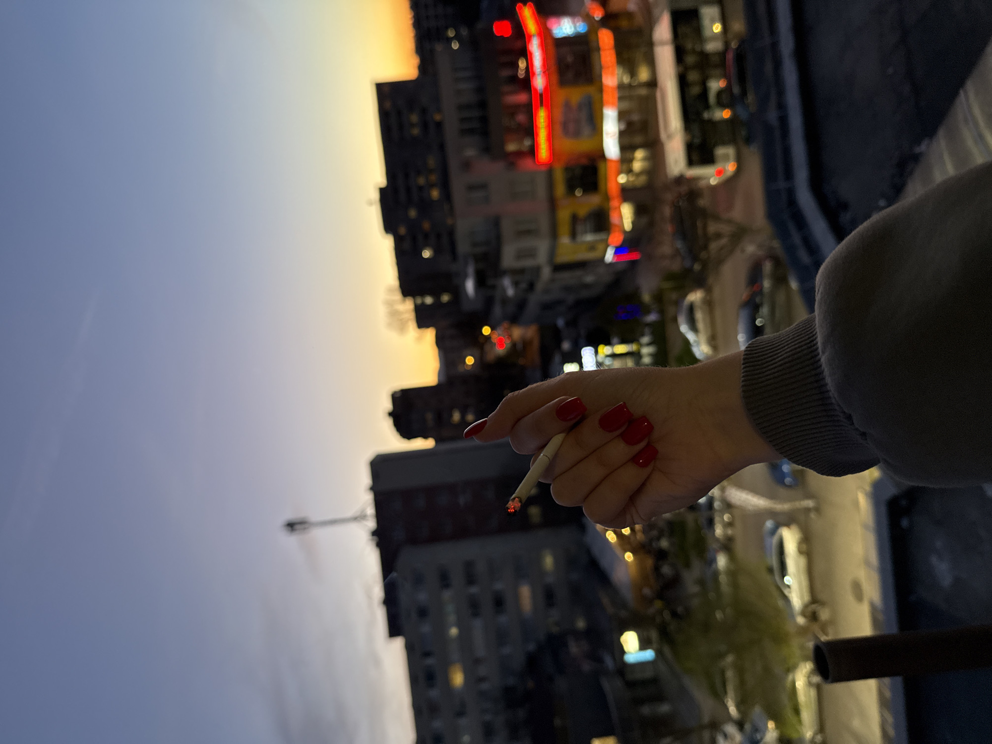 An arm, belonging to a person with red nails, is holding a lit cigarette. The background shows a cityscape at dusk, with buildings of varying heights and styles, suggesting an urban environment. Lights from buildings and streetlights are visible. In the distance, there are structures with glowing neon signs. The scene appears to be shot from a high vantage point, such as a balcony. The image could be in Sofia, Bulgaria, given the architectural style and urban setting, but this would require additional verification.