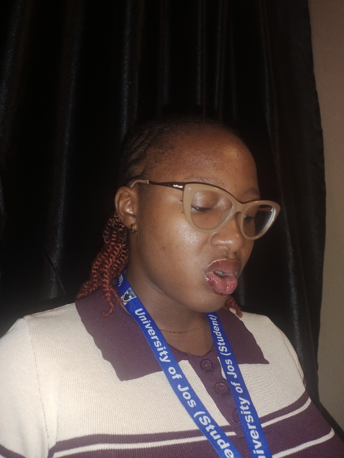 The image presents a close-up portrait of an individual identified as being in Rafin Par, Nigeria. The subject is a female with dark skin, positioned slightly off-center to the right. She is wearing light-colored, possibly beige or pale brown, cat-eye style eyeglasses. Her eyes are directed downwards or closed. Her mouth is open, with the tip of her tongue slightly protruding and appearing moist. Her hair is styled in braids on the scalp, with reddish-brown twisted extensions visible near her left ear. She is adorned with small gold-colored hoop earrings and a thin gold-colored necklace. Around her neck is a blue lanyard displaying white text that reads "University of Jos (Student)". She is wearing a collared knit top featuring horizontal stripes in off-white and a darker, possibly maroon, color, with a matching darker-colored collar and button placket. The background is composed of dark, vertically folded fabric, consistent with a curtain, indicating an indoor environment.