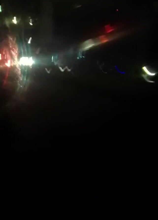 The video appears to be taken from inside a moving vehicle at night. There are streetlights and headlights of other vehicles visible through the windshield, creating blurry streaks of light. The road ahead is dimly lit. The general setting is an urban or suburban environment, as indicated by the presence of street lighting and other vehicles. The exact location or activity is difficult to discern due to the blurriness and darkness.