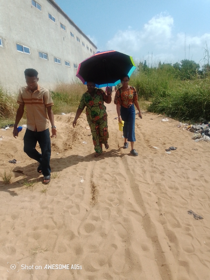 The image depicts three individuals walking on a sandy path in Egbagu, Nigeria, under a bright, partly cloudy sky. The path, marked with tire tracks and footprints, is flanked on the left by a multi-story, light-colored building with rows of small, rectangular windows. Dry grass and weeds grow between the building and the path. On the right, the path borders an area of dense, tall green and dry vegetation, with a visible accumulation of litter and debris, including plastic bags and bottles. In the distance, utility poles and more trees are visible. From left to right, the individuals are: 1. A male, wearing a striped tan and brown short-sleeved shirt, dark blue jeans, and dark sandals. He holds a small blue object in his right hand and is looking downwards to his left. 2. A female, wearing a green, red, and black patterned dress or two-piece outfit and dark sandals. She holds a large, black umbrella with rainbow-colored edges overhead, providing shade to herself and the female next to her. She is looking forward. 3. A female, wearing a patterned orange and brown short-sleeved top, dark blue cropped trousers, and dark closed-toe shoes. She wears glasses and carries a yellow item in her right hand while looking forward. All three individuals are walking in the same general direction, from the background towards the foreground and slightly to the left. The scene is illuminated by strong sunlight, casting visible shadows. A watermark "Shot on AWESOME A05s" is present in the lower-left corner.