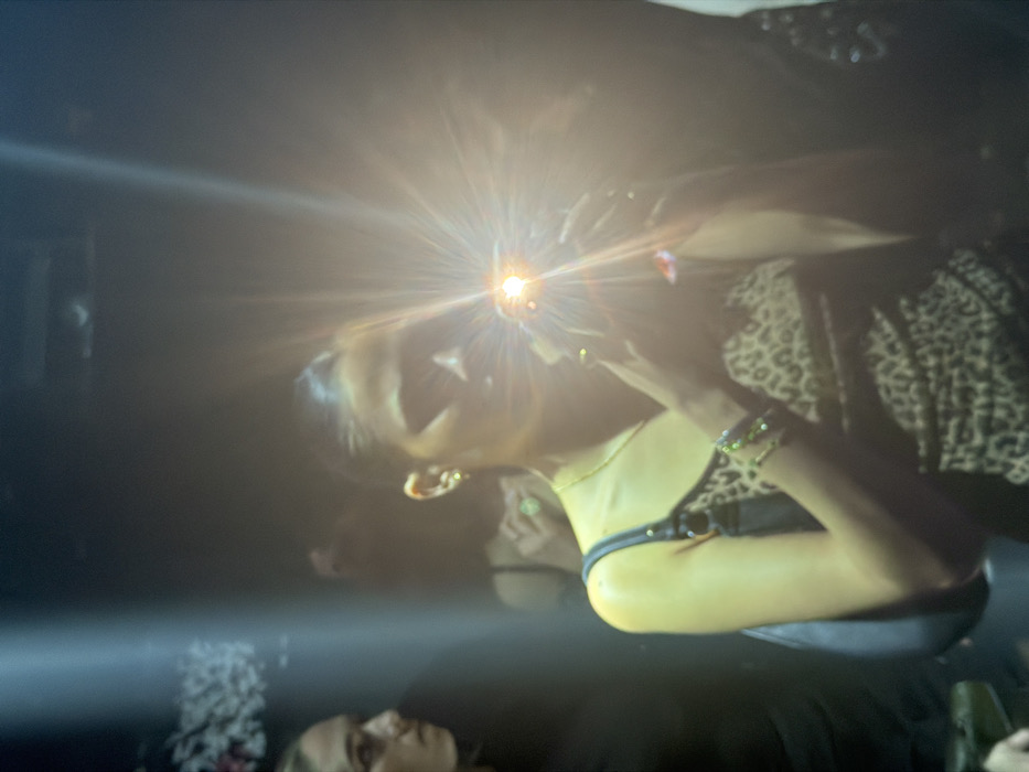 A woman holds a bright light source to take a picture. She wears a patterned top, gold jewelry, and a black top. Light flares from the camera on her phone. Another person is visible in the bottom corner of the frame. The surroundings appear dark and hazy. The orientation of the photo is horizontal.