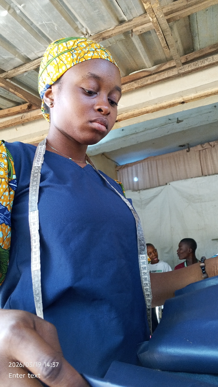 The image depicts a young Black female, likely engaged in tailoring, in the city of Gama, Nigeria