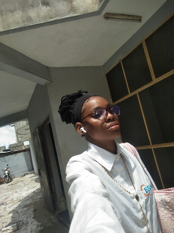 This image depicts a brightly lit outdoor or semi-outdoor scene in Cotonou, Benin. **Subject:** A female individual of dark complexion occupies the right and central foreground, looking slightly upwards and to the right. She wears a white collared, long-sleeved shirt with "ESA" embroidered in orange and blue on the right chest area. A long, gold-colored beaded necklace with a central medallion hangs around her neck. She wears round-rimmed eyeglasses with patterned frames and a white wireless earbud in her left ear. Her hair is styled in black braids, pulled back and secured by a black headband. A light pink or patterned shoulder bag is visible over her right shoulder. **Environment (Immediate):** The individual is situated under a concrete overhang or within a covered walkway. The ceiling is light grey/off-white, exhibiting some wear and discoloration, and features an unlit horizontal fluorescent light fixture. Grey structural beams are visible. To the right, a wall contains multiple rectangular panels, possibly windows or ventilation, with dark inserts framed by lighter wood or metal. **Environment (Background):** To the left of the individual, an uneven, light-colored paved surface extends into the mid-ground. A white two-wheeled scooter (moped) is parked on this surface in the mid-left. Further in the background, low-rise structures and a white cylindrical water tank on a rooftop are visible under a partly cloudy sky.