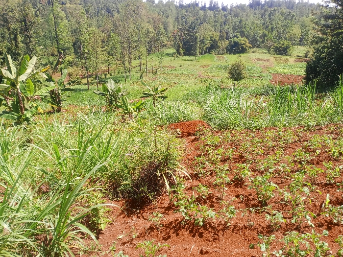 The image displays an agricultural landscape in Kiangochi, Kenya, under natural daylight. In the foreground, reddish-brown soil supports rows of young, small green plants, likely recent plantings. To the left, several banana plants with broad green leaves are visible, alongside patches of tall green grass and a mound of excavated reddish-brown earth. The midground reveals a series of cultivated plots with varying stages of plant growth, including organized beds of low-lying green crops and areas of taller vegetation. Sparse, slender trees are scattered throughout these fields. The background is dominated by a dense, lush green forest covering a hillside under a bright sky. No individuals, animals, or artificial structures are present.