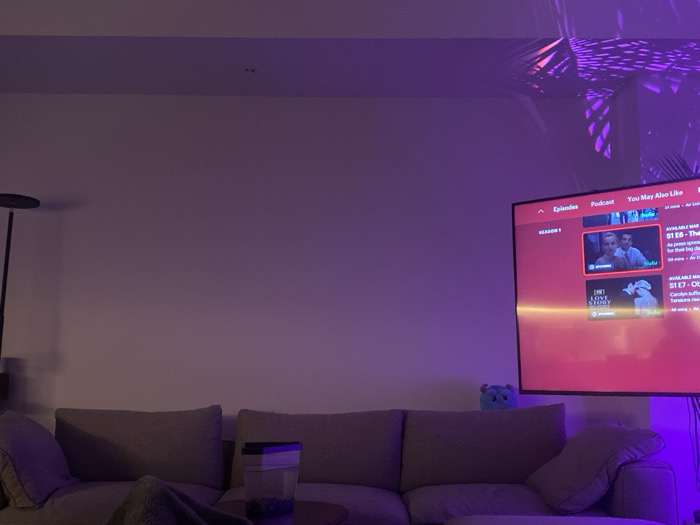 This image depicts a residential interior, located in the city of Miami, United States of America. The scene is characterized by dim lighting and a prominent purple ambient glow, with a distinct patterned purple light projected onto the upper wall and ceiling. On the left, a portion of a dark-colored floor lamp is visible. A large, neutral-toned sectional sofa occupies the lower half of the frame. A dark grey throw blanket is draped over the leftmost section of the sofa. A clear plastic container, containing dark objects, rests on a low surface positioned in front of the sofa. A small, light blue stuffed toy is situated on the back cushion of the sofa, towards the right side. A large, wall-mounted flat-screen television is visible on the right, displaying a streaming service interface with a predominantly red background. The screen shows menu options such as "Episodes," "Podcast," and "You May Also Like." Two episode thumbnails are partially visible: one features two individuals, and another is labeled "LOVE STORY." The television screen emits a strong red light. No individuals are present in the depicted scene.