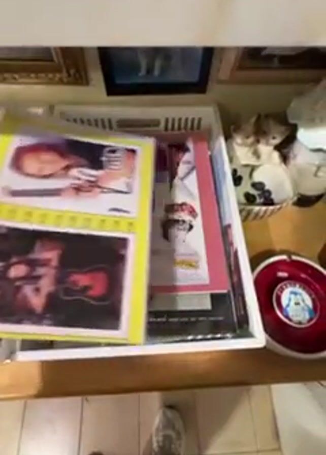 A person is shown removing items from a white plastic storage container. The container is sitting on a light brown surface, likely a table or shelf, and contains a variety of items including a magazine cover with the title "Splitting Heirs," a poster for Def Leppard's Greatest Hits Vault, and other papers. The shelf unit is also cluttered with items, including pictures in frames and decorative figurines. The person's arm and torso are visible, and they are wearing grey sneakers and dark pants. The floor is tiled in beige and white.
