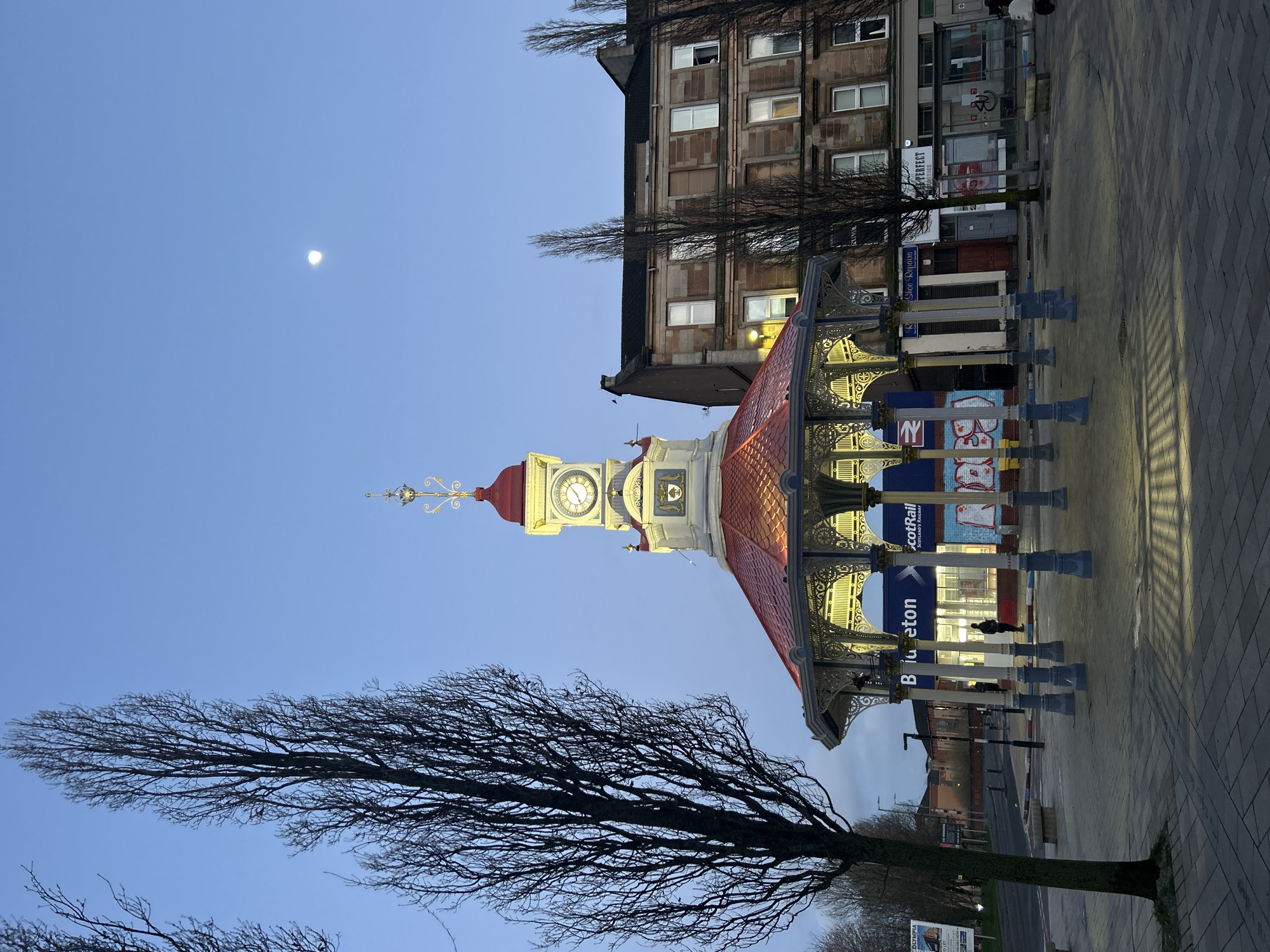 view of Bridgeton Cross in Glasgow, Scotland. The prominent landmark is the Bridgeton Umbrella, with its red roof and clock tower. A bare tree is in the foreground, and a building with multiple windows is visible in the background. In the upper left corner, the moon is visible in the dusk sky. Signage for ScotRail indicates the station is a transport hub. Several people are faintly visible at the train station. The ground is paved.