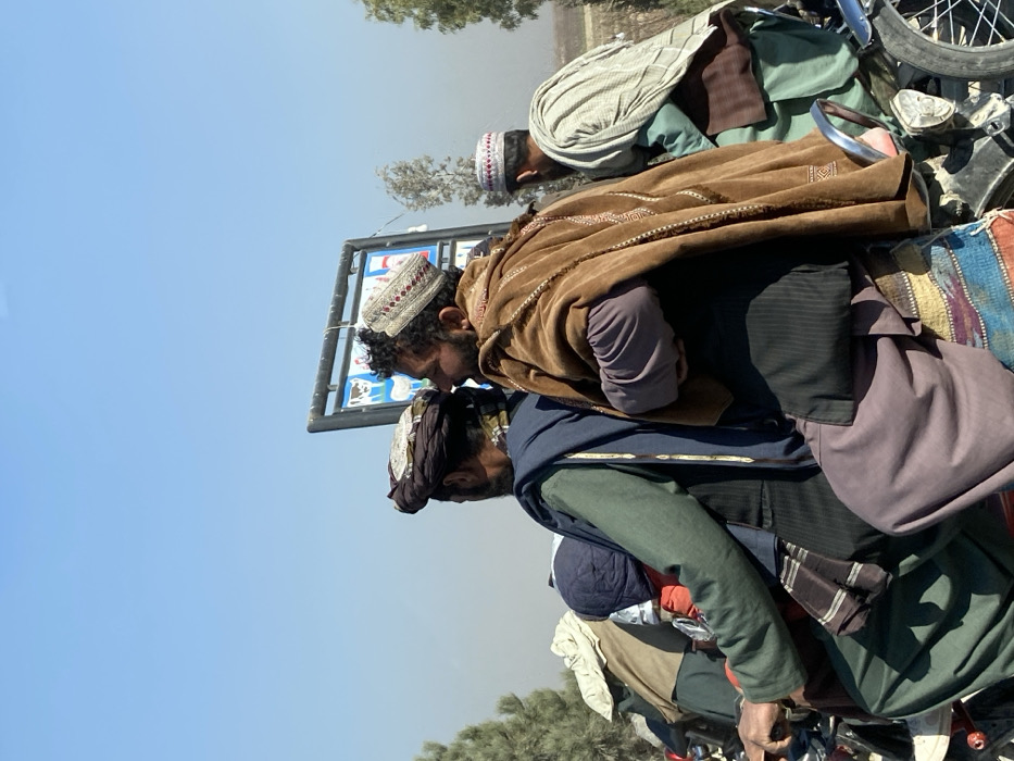 Three men are on a motorcycle outdoors. The rider is in the front, wearing a black turban and green sleeves. The middle passenger is wearing a brown velvet shawl and a hat. The rear passenger is wearing a white turban. The motorcycle appears heavily loaded with bags and personal items. The sky is blue. A sign is behind the middle passenger.