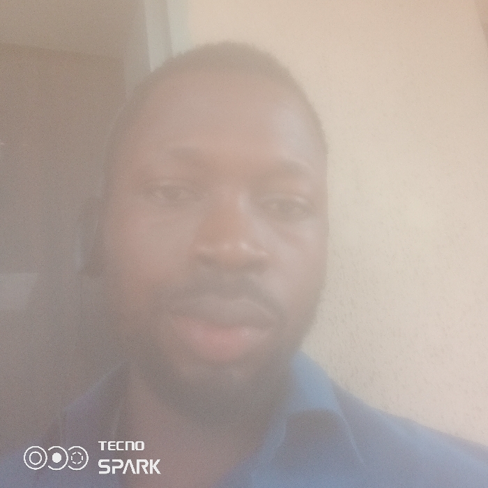A blurry, hazy close-up photograph depicts an adult male of African descent, facing the camera directly. The man has short dark hair and a dark beard or stubble. He is wearing a light blue collared shirt. His mouth is slightly open. The background is a plain, light-colored interior wall. A 'TECNO SPARK' watermark is visible in the bottom left corner of the image. The scene is located in Ikeja, Nigeria.