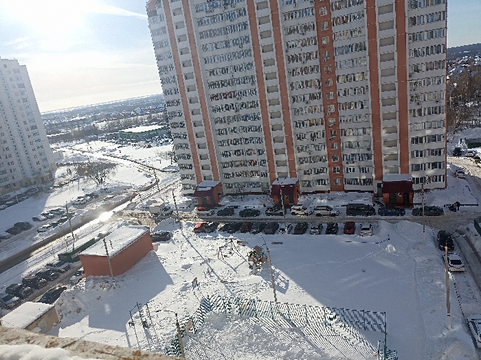 This image depicts a snow-covered residential area in Serpukhov, Russia, under clear daylight conditions. The scene is dominated by two tall, multi-story residential apartment buildings. The building on the right, prominently featured, has light-colored facades with vertical reddish-orange striping and numerous windows, many with visible balconies or air conditioner units. Two ground-level entrance structures with red sloped roofs are visible at its base. A similar, partially visible building is situated on the left. The ground is extensively covered in a layer of white snow, with long shadows cast across it, indicating direct sunlight from a low angle. Numerous vehicles are parked in snow-dusted parking lots and along roads, with visible tire tracks in the snow. In the midground, a smaller, single-story rectangular building with a red top is present. Adjacent to this, a snow-covered children's playground with discernible equipment, including a swing set and a slide frame, is located. In the lower right, two dark-clad figures are visible on a snow-covered path, one partially obscured by a utility pole, engaged in an indistinct activity near a parked white vehicle. A winding, snow-covered path or road is visible in the background, separating residential blocks from a more distant landscape that includes bare trees and additional structures. Fencing or barriers are partially visible in the immediate foreground, also covered in snow.