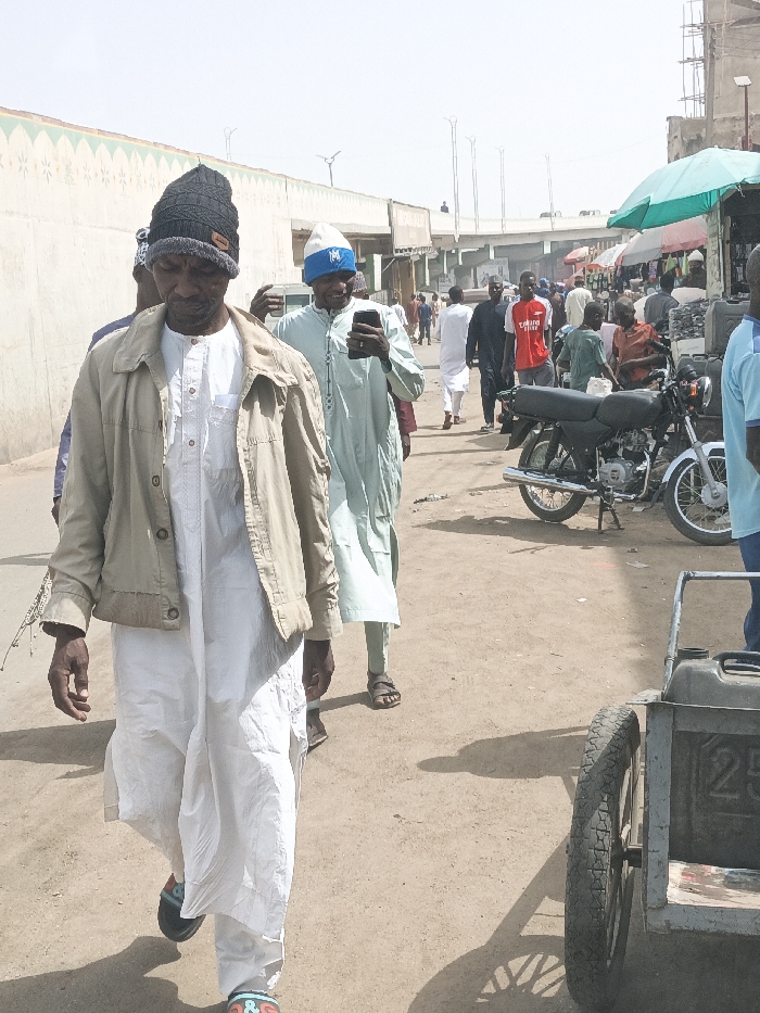 The image depicts a busy outdoor scene in Fagge C, Nigeria, under bright daylight