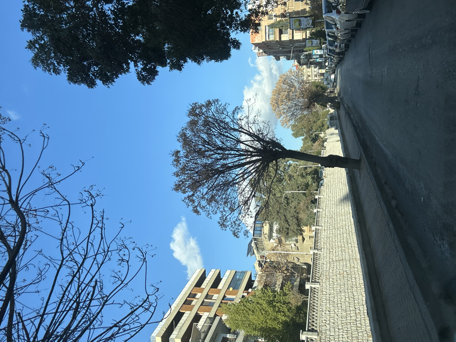 The image depicts an urban street scene in Al-Muhajerin Municipality, Syria, under a clear blue sky with scattered white clouds. The perspective is from a low vantage point, likely from within a vehicle, looking down a street that recedes into the distance. In the immediate foreground, the dark asphalt roadway shows signs of wear. To the left, a grey concrete sidewalk runs alongside a substantial retaining wall constructed from light-colored, rough-hewn stone blocks, capped with lighter concrete coping and intermittent decorative posts. A tall, bare-branched deciduous tree stands prominently on this sidewalk, slightly leaning towards the street. Along the left side of the street, beyond the retaining wall, multi-story residential buildings are visible. The leftmost building features light-colored facades with multiple balconies and horizontal brown architectural elements. Further along the left, more buildings are interspersed with green trees and shrubs, and one rooftop displays solar panels. The street itself is lined on its right side by a continuous row of parked passenger vehicles, including sedans and SUVs of various colors (white, silver, grey, dark), all facing away from the camera. Another tree with sparser, lighter-colored foliage stands on the left side of the street further down, followed by additional trees and more multi-story buildings in the background. A dense canopy of dark green trees extends into the frame from the upper right. Streetlights are intermittently visible along both sides of the thoroughfare, and a street sign or billboard with green and white graphics is noticeable on the right side in the mid-distance. No individuals or explicit actions are discernible within the frame. The scene is bathed in bright daylight.